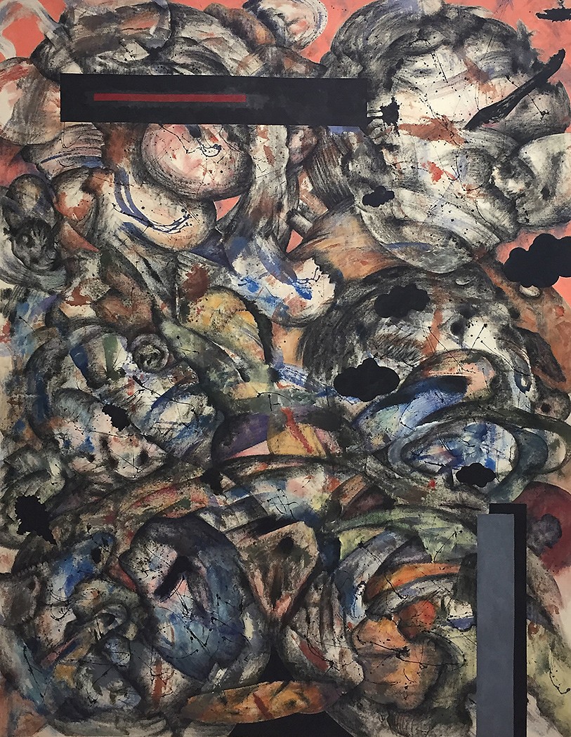 acrylic, charcoal, colored pencil on canvas, 64 x 73 in. (162.6 x 185.4 cm)