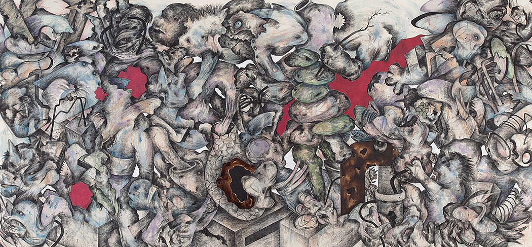 acrylic, charcoal, colored pencil on canvas, 76 x 124 in. (193 x 315 cm)